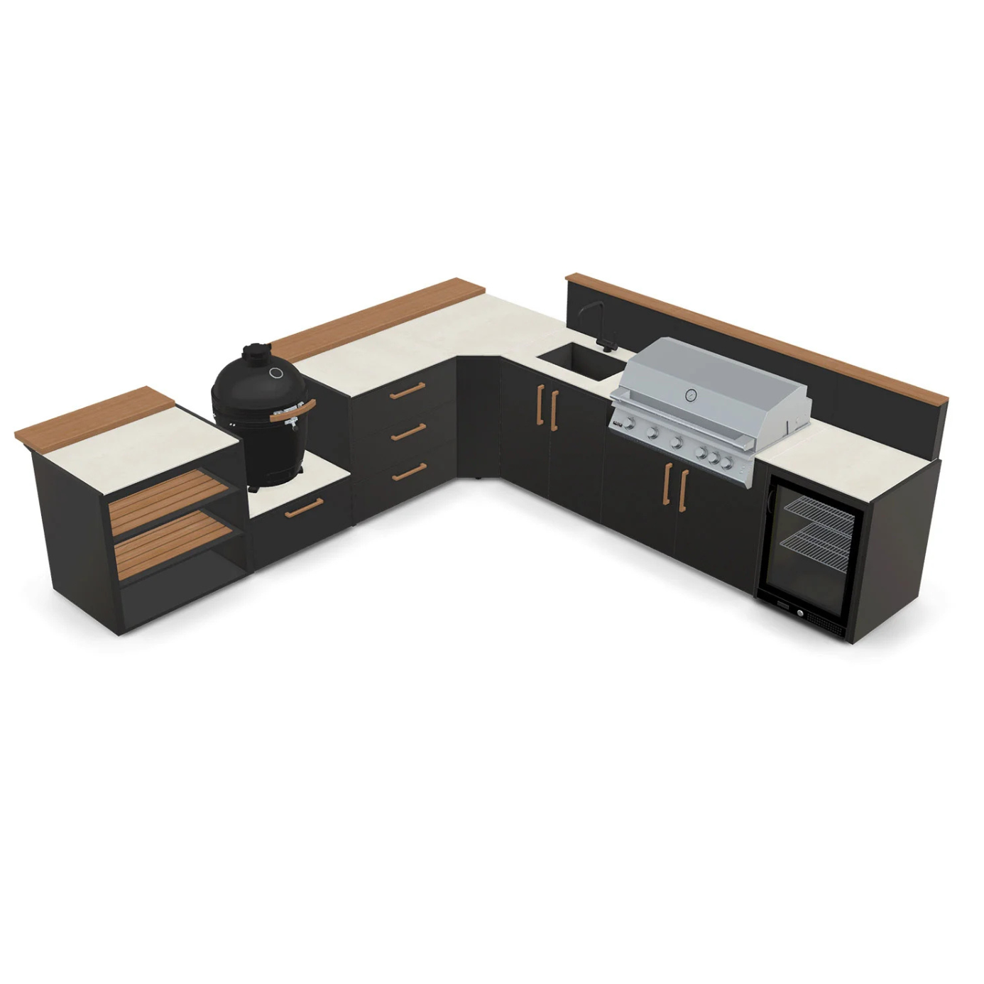 Naši kuhinjski moduli so zasnovani s španskim navdihom in izdelani iz visokokakovostnih materialov, ki so odporni na vremenske vplive. To zagotavlja dolgo življenjsko dobo tudi v najbolj ekstremnih razmerah. Uporabljeni materiali, kot so trpežno galvanizirano jeklo s dvojnim prašnim premazom (certificiranim s strani Qualicoat) in robusten bambusov les, ne zagotavljajo le vzdržljivosti, temveč dodajo tudi estetski pridih vašemu zunanjemu prostoru. Ročaji iz bambusovega lesa prinašajo topel videz, medtem ko kuhinjski pult Neolith® doda eleganco. Če niste ljubitelj lesa, so na voljo tudi ročaji iz nerjaveče pločevine, ki jih lahko pobarvamo v elegantno črno mat barvo za še bolj sofisticiran videz.