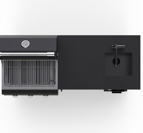 Premium žar iz nerjavečega jekla v črni barvi združuje izjemno moč segrevanja in vrhunski videz. Vgrajen 60 L hladilnik poskrbi, da so sestavine za kuhanje in pijače vedno ohlajene, medtem ko kombinacija pomivalnega korita in koša za smeti omogočata enostavno pripravo in čiščenje. Visoko zmogljiv stranski gorilnik nudi dodaten prostor za kuhanje omak ali prilog, prostorne omarice in predali pa zagotavljajo veliko prostora za shranjevanje in popolno urejenost. Trpežen pocinkan okvir s prašnim premazom nudi zanesljivo odpornost na vremenske vplive, vgrajen odpirač za steklenice pa je vedno pri roki, ko si zaželite osvežitve. Zahvaljujoč skritim kolesom in nogam na zaklepanje lahko kuhinjo enostavno premaknete tja, kjer jo potrebujete, ter jo spremenite v stabilno in varno delovno postajo.