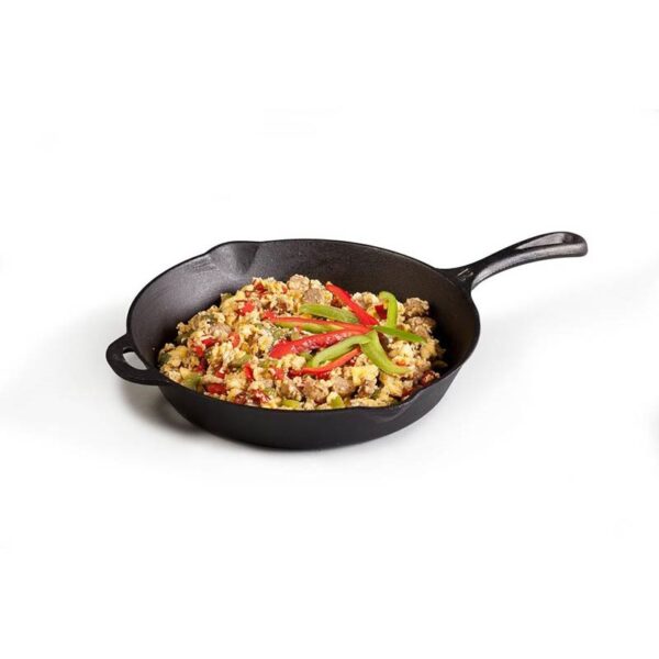 Ponev lahko uporabljate v pečici, na štedilniku, odprtem ognju, plinu ali indukciji. Izboljšana je s prijemalnim ročajem in dodatnim ročajem za pomoč pri premeščanju večje teže. Tako lahko ponev brez težav dvignete. Dvojno odlivno korito omogoča odlivanje odvečne maščobe.