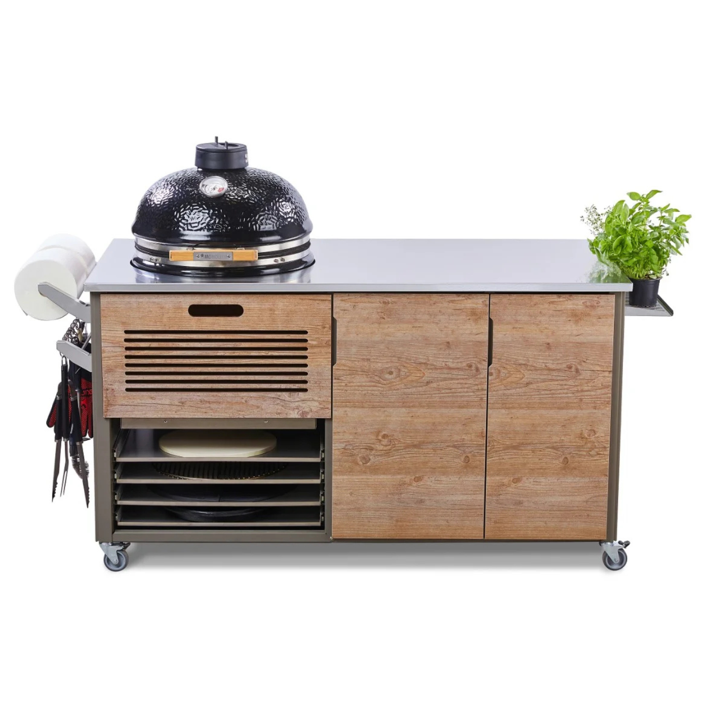 Omarica ima štiri predale za večje pripomočke, kot so rešetka iz litega železa, kamen za pico, deflektor ali pekač. Na voljo je tudi predal s prostornino 213 litrov, s tremi nastavljivimi policami za vse dodatke, omake, začimbe, lonce, ponve in posodo ter ostale pripomočke. Kuhinja vsebuje tudi omarico, kamor lahko shranite vreče z ogljem. Vsi predali imajo tečaje za mehko zapiranje.