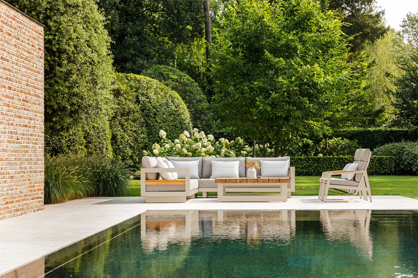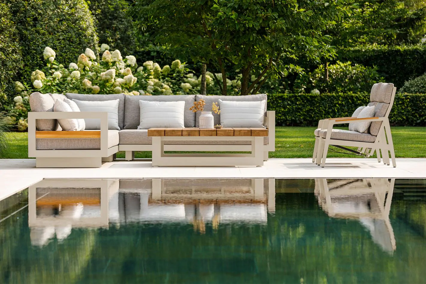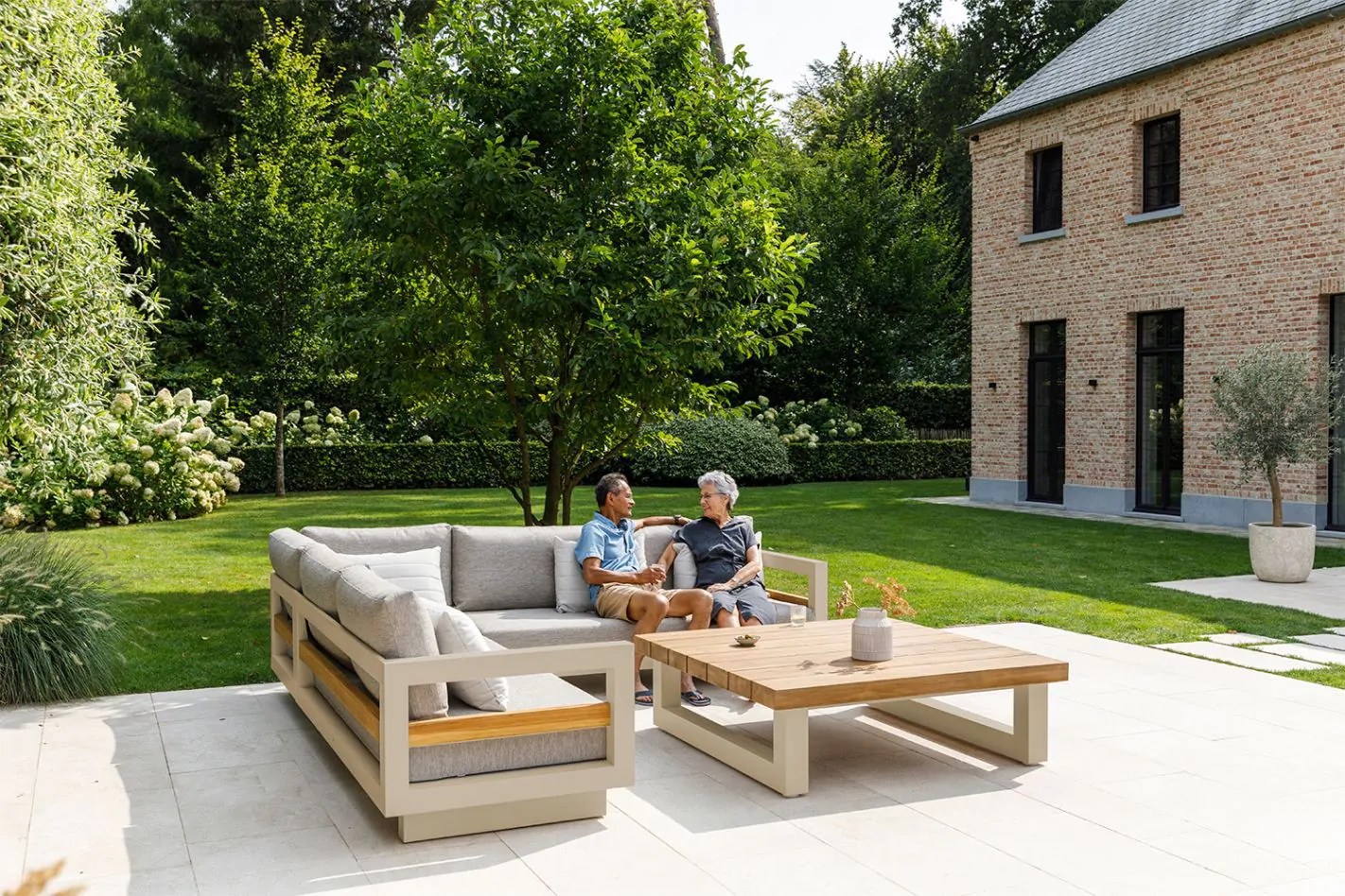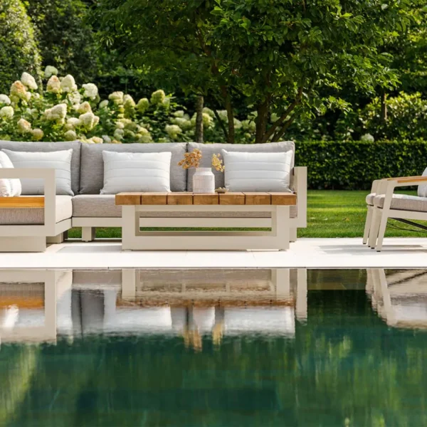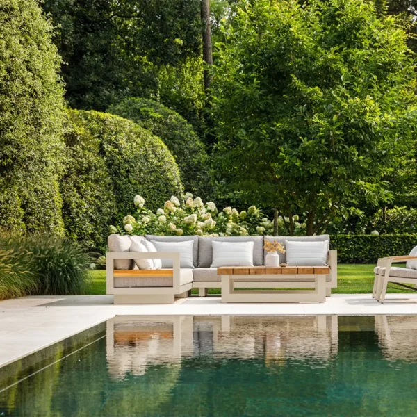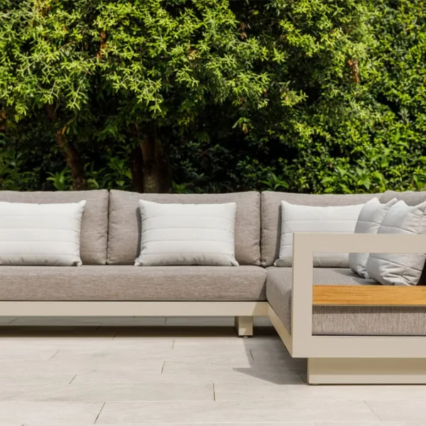 Konstrukcija iz aluminija v bež barvi zagotavlja odlično odpornost proti vremenskim vplivom, medtem ko leseni detajli iz tikovine dodajo naraven in topel pridih. Mehke blazine v tkanini Soltex omogočajo popolno udobje in sprostitev, lesena mizica pa dopolnjuje celoten set, ki ustvarja popoln prostor za uživanje v družbi prijateljev in družine.
