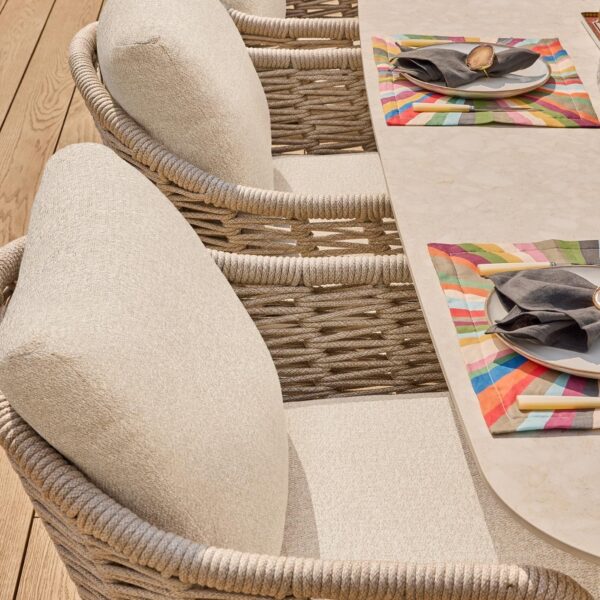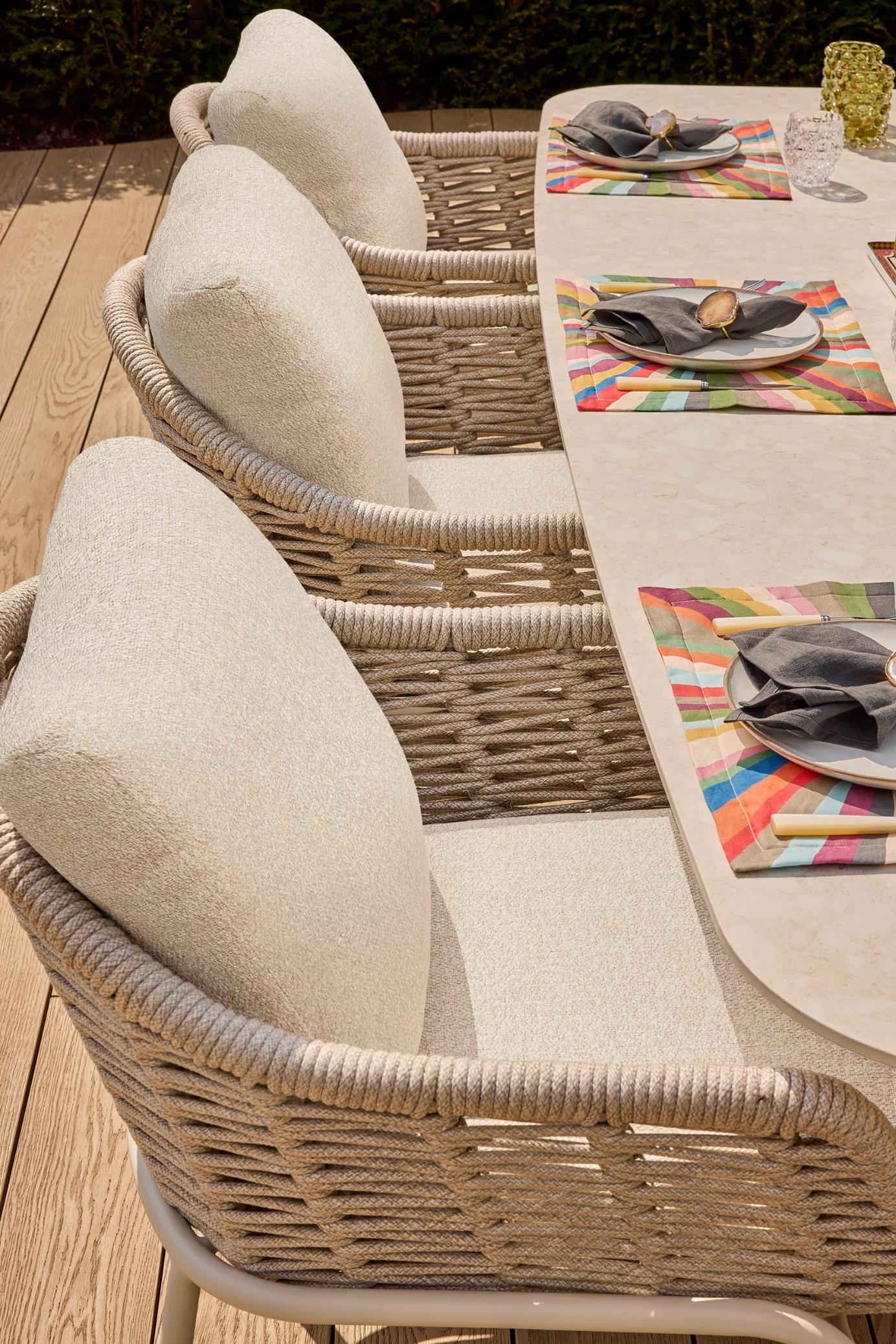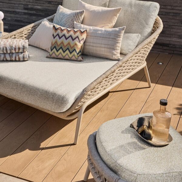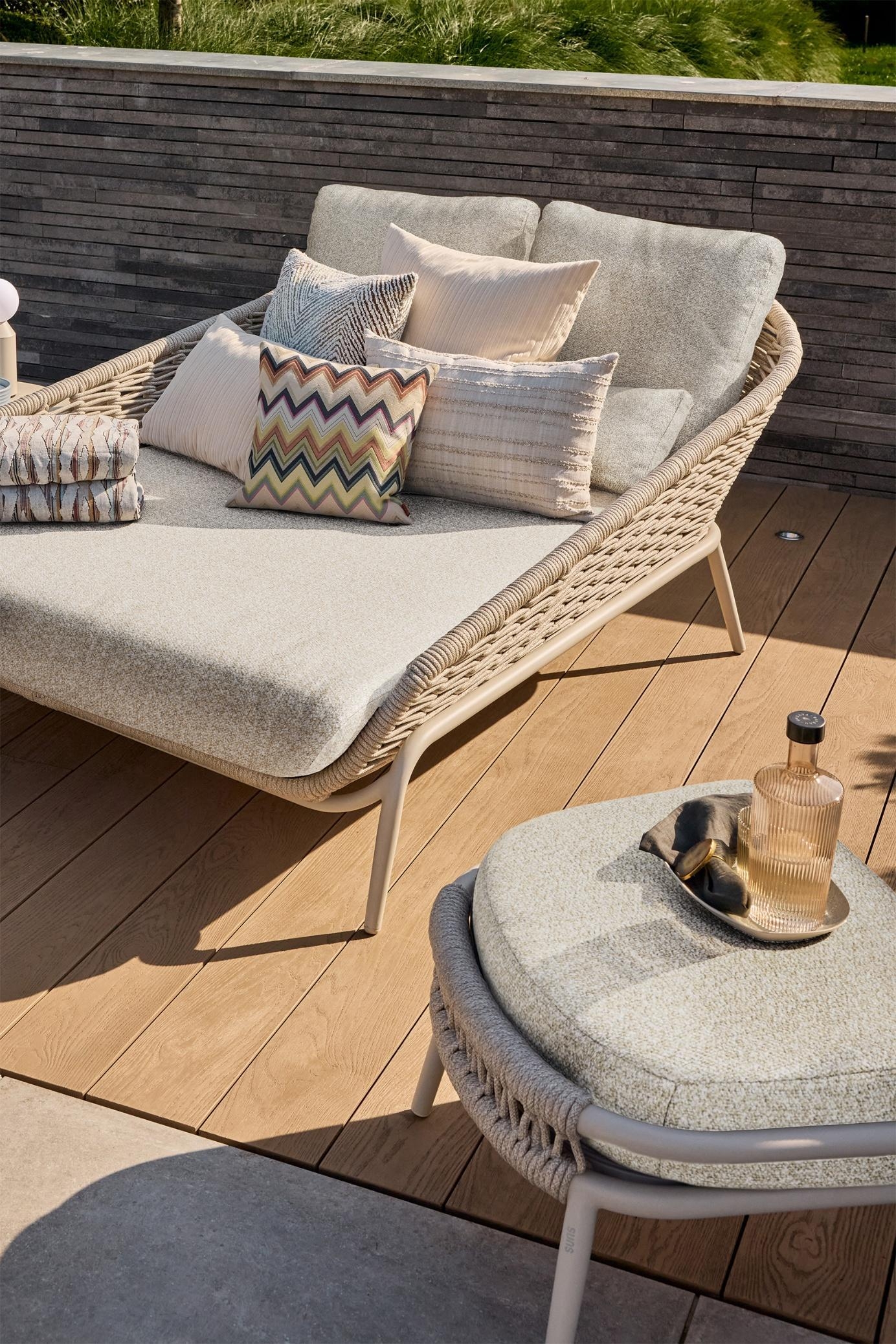 Casto je izdelan iz visokokakovostnega aluminija in prepleten z 9 mm vrvjo iz akrilnega materiala, ki je odporna na UV-sevanje, vremenske vplive in je enostavna za čiščenje. Slog vrvi, ki objema okvir, postelji daje subtilno teksturo in prefinjen videz, medtem ko odprta konstrukcija poudarja občutek lahkotnosti in sodobne elegance.