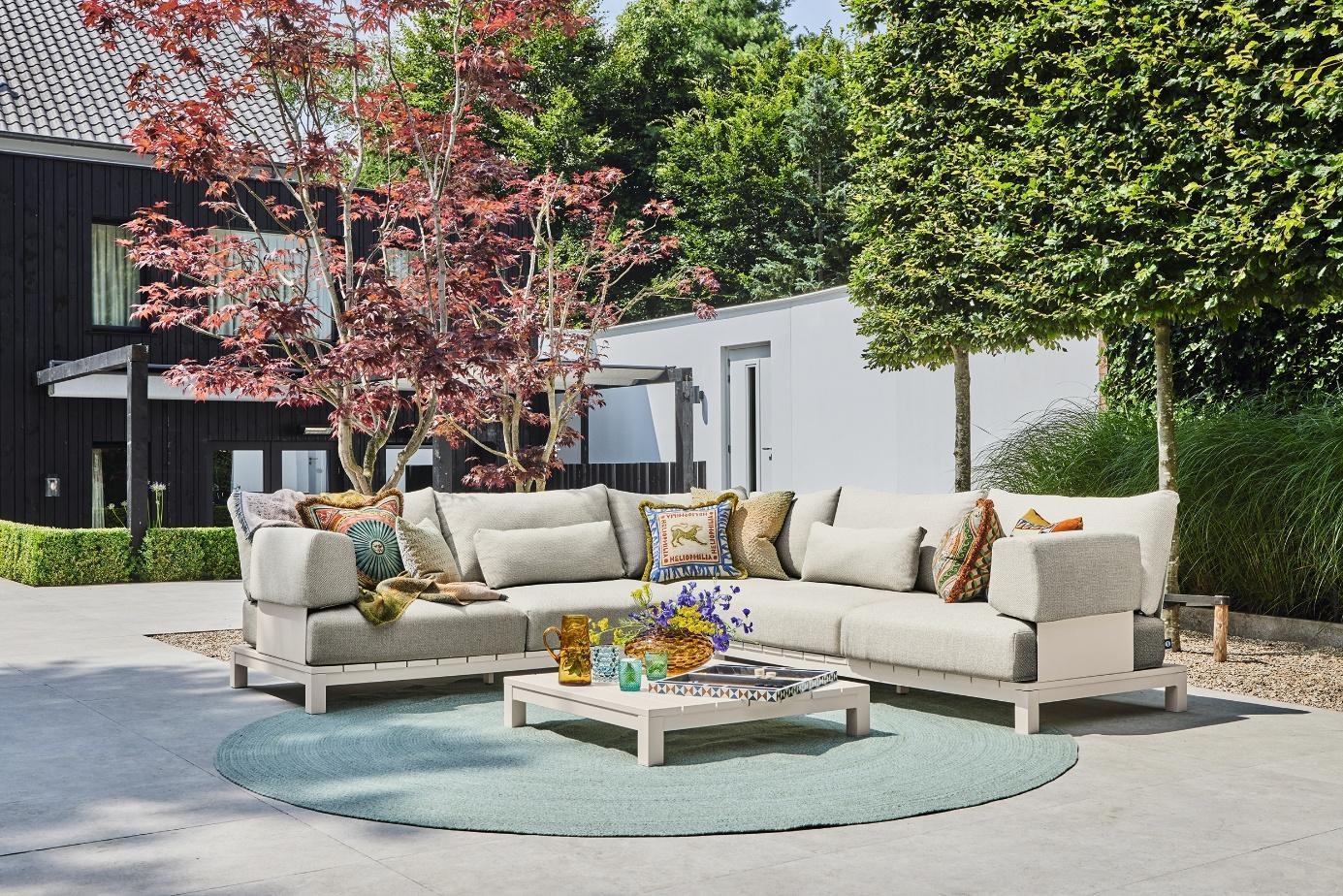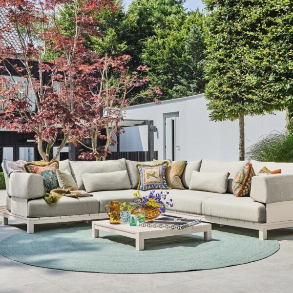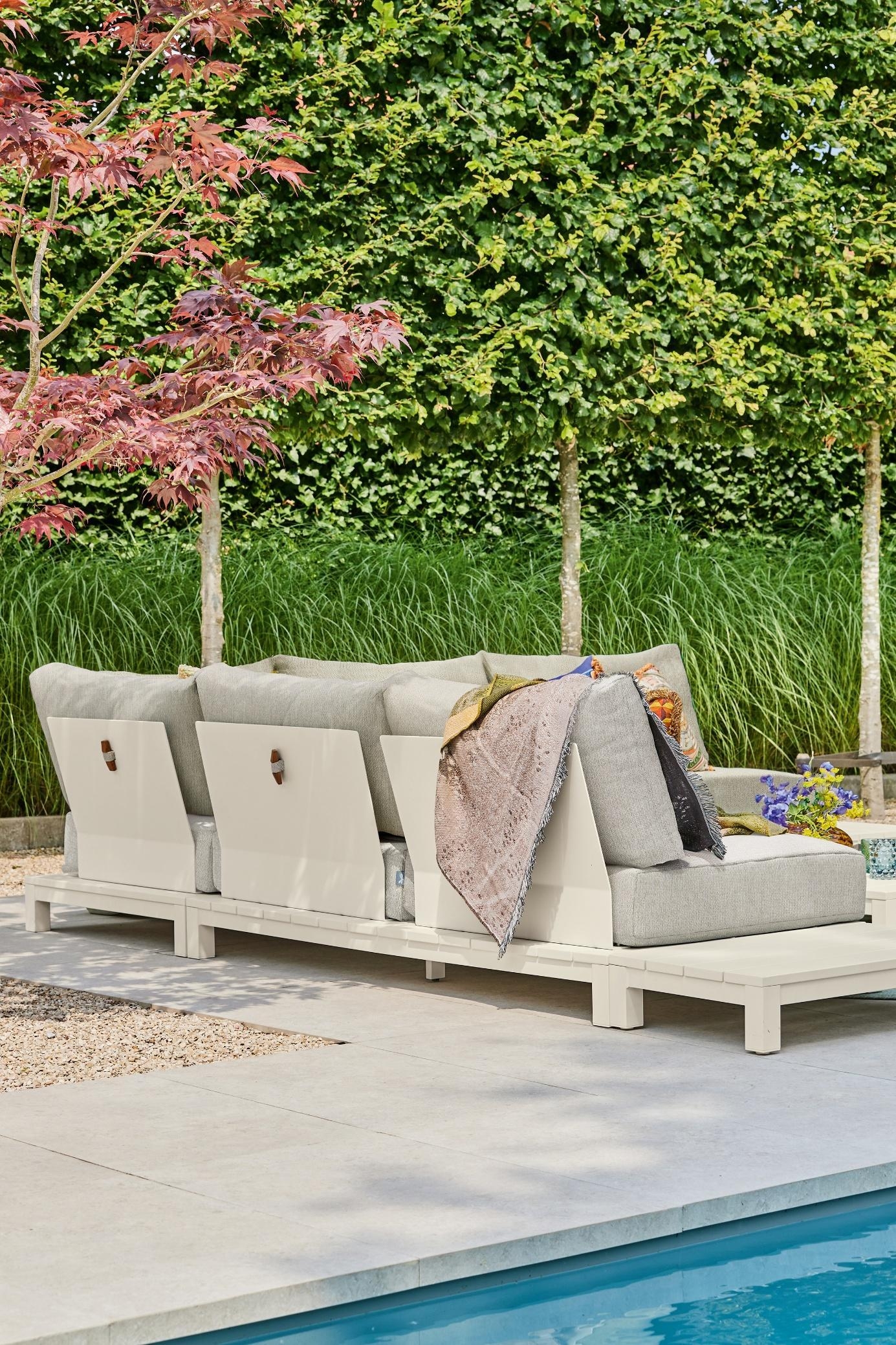 Blazine so na voljo v prestižnih bouclé tkaninah Seashell ali Pebble Desert, ki prostoru dodata teksturo, mehkobo in izrazit premium značaj. Tkanine so posebej razvite za zunanjo uporabo – odporne na UV-žarke, vlago in vsakodnevne vplive okolja.