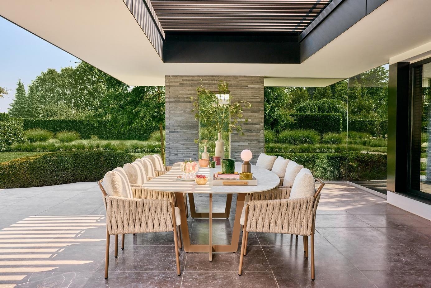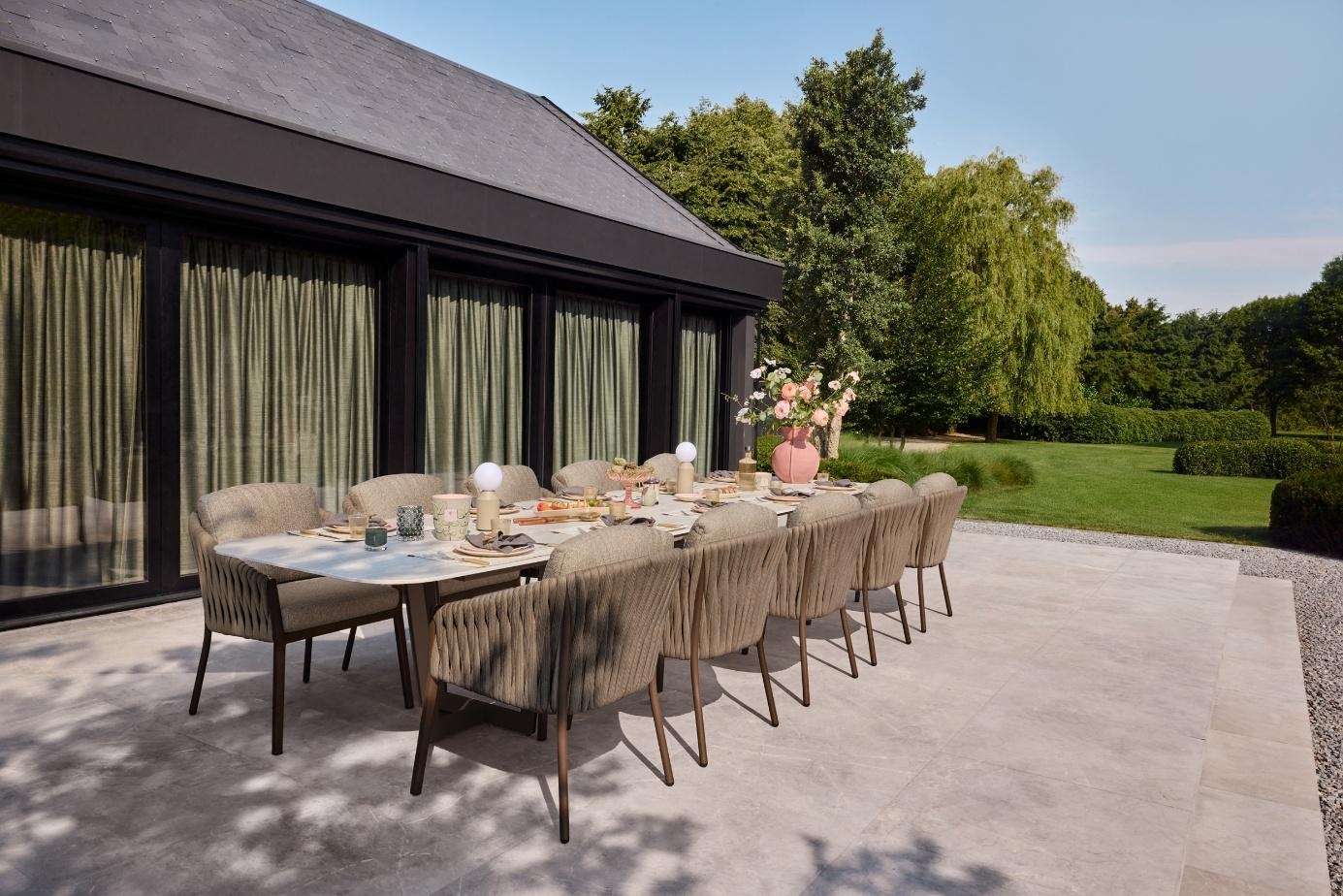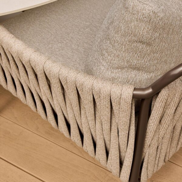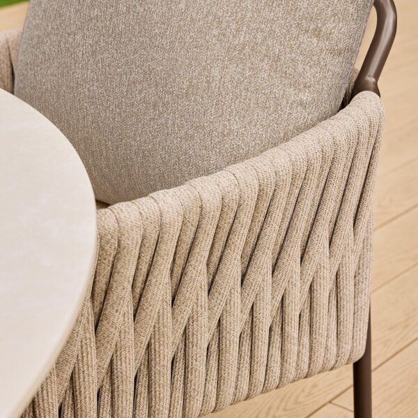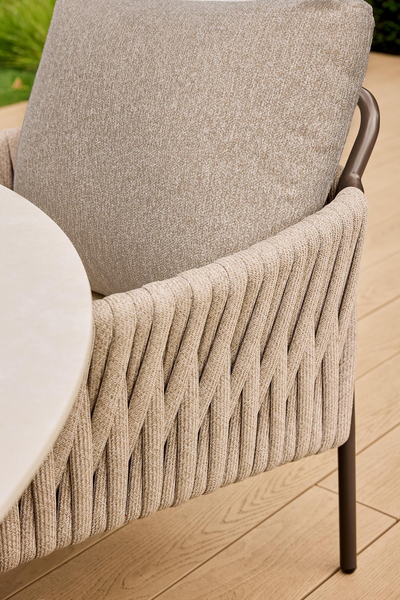 Jedilni stoli Fiavè so zasnovani z mislijo na popolno ravnovesje med arhitekturno čistostjo in mehko eleganco. Stabilno aluminijasto ogrodje dopolnjuje ročno navdihnjen rope preplet, ki ustvarja prepoznaven, prefinjen značaj kolekcije.