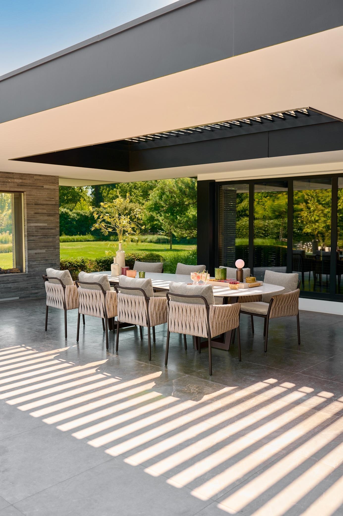 SUNS Fiavè z mizo Palermo je ultimativna izbira za ustvarjanje prestižnega zunanjega jedilnega prostora – sinonim za luksuz, prilagodljivost, trajnost in vrhunsko oblikovanje.