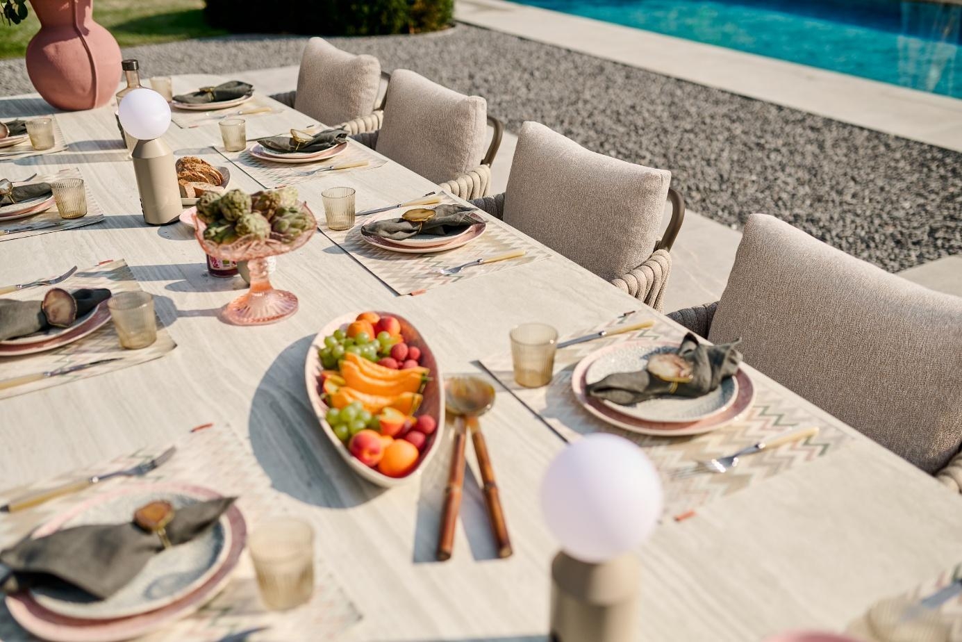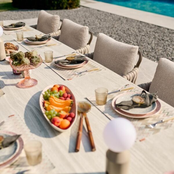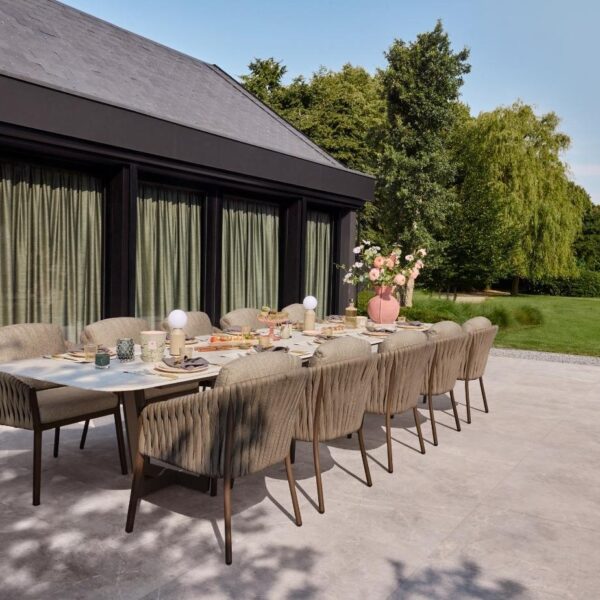Osrednji poudarek garniture je miza Palermo. Njena konstrukcija iz debelega aluminija zagotavlja izjemno trdnost in stabilnost, medtem ko Neolith® plošča v odtenku Terrazzo Light Taupe predstavlja tehnološki vrh sodobnih zunanjih materialov. Mize so na voljo v različnih dolžinah – od elegantnih 240 cm, ki se prilegajo manjšim terasam, do mogočne 420 cm, ki ustvarjajo osrednji razkošen prostor za druženja. Prav tako so na voljo različni materiali in površine namiznih plošč, kar omogoča popolno prilagoditev stilu vašega zunanjega prostora. Izdelane so s postopkom sintranja iz 100 % naravnih surovin, kar zagotavlja neporozno, izjemno trdo in na praske odporno površino. Odporna je na vse vremenske pogoje – od močnega sonca do nizkih temperatur – ter skozi leta ohranja svoj brezhiben, prestižen videz.