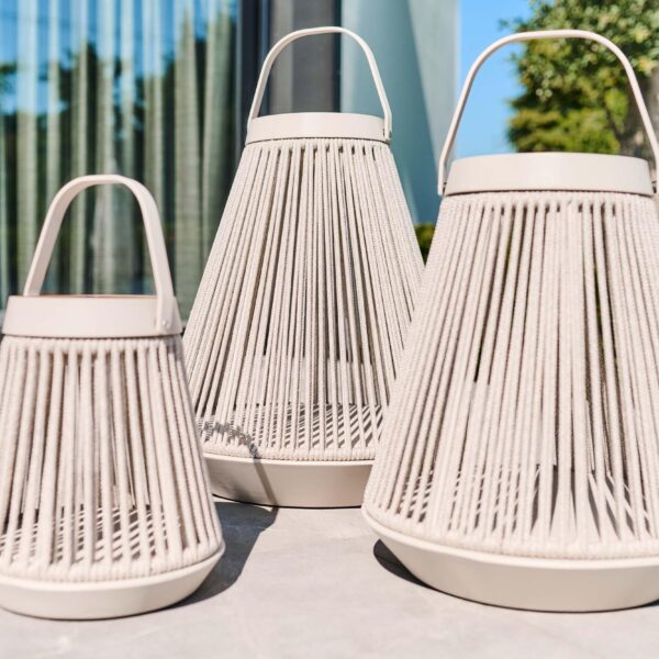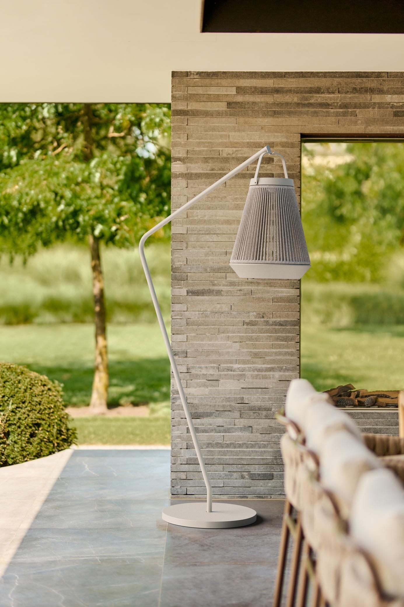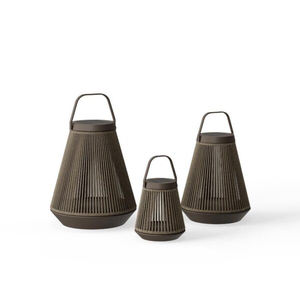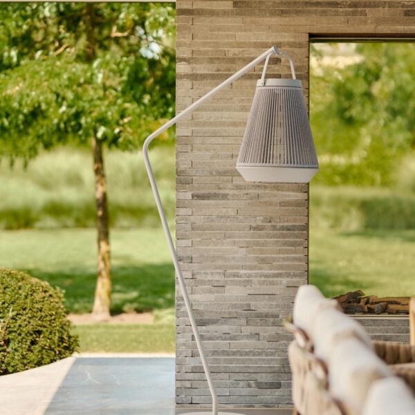 Aluminijasto ogrodje je v celoti ovito s prefinjeno vrvjo, ki svetilki daje mehak in eleganten videz ter ustvarja prijetno filtriranje svetlobe. Značilna oblika, ki spominja na šahovskega kmeta, zagotavlja stabilno osnovo in prepoznavno silhueto, ki se lepo poda na teraso, balkon ali vrt.