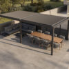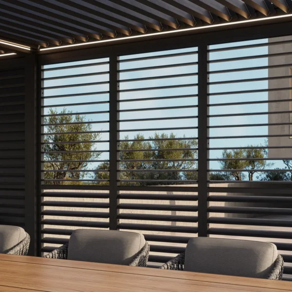 Z nastavitvijo naklona lamel je mogoče enostavno nastaviti količino svetlobe, ki jo želimo pod pergolo. V kolikor želimo popolnoma odprt pogled, panele enostavno potisnemo na eno stran.