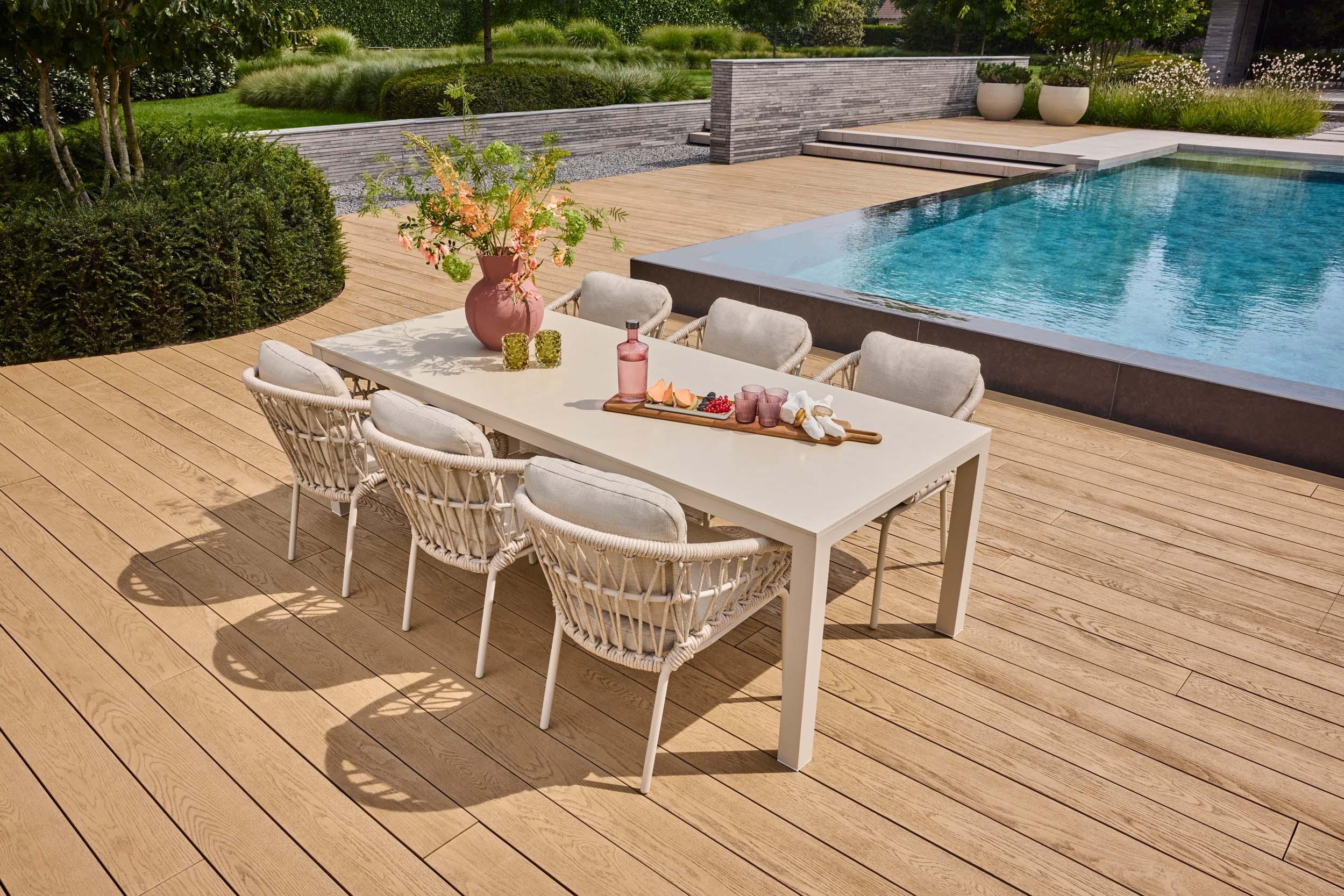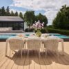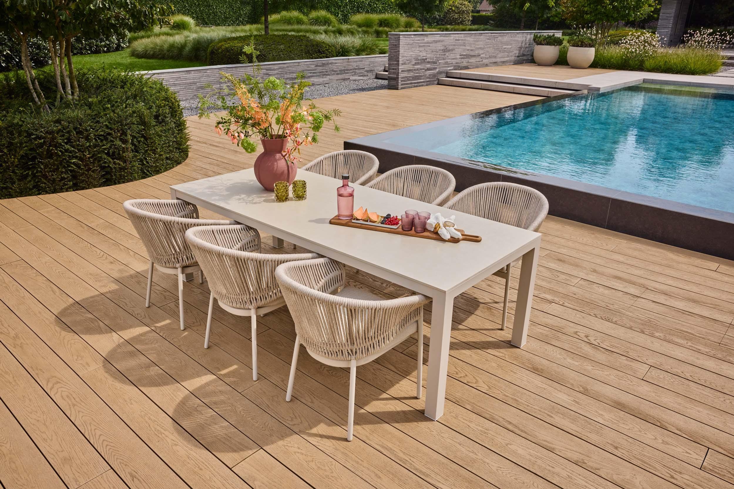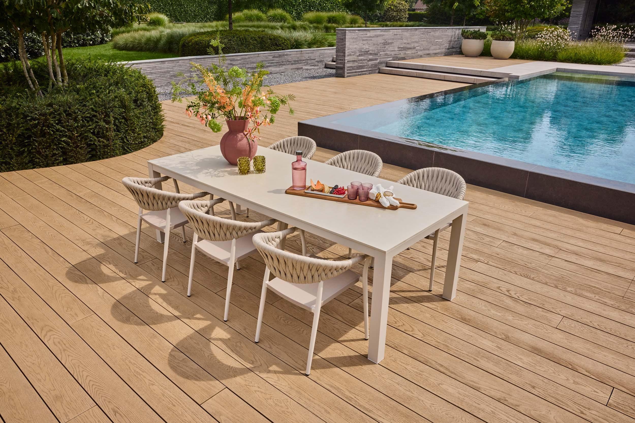 Monte Vari omogoča svobodno kombiniranje z različnimi modeli stolov – od rope izvedb do bolj minimalističnih aluminijastih različic. Tosca pa s svojo toplino in teksturo predstavlja eno najbolj prefinjenih izbir.