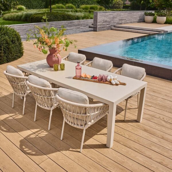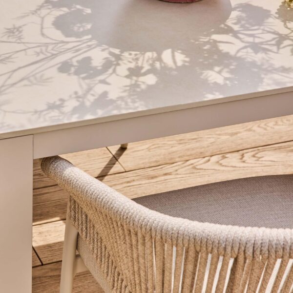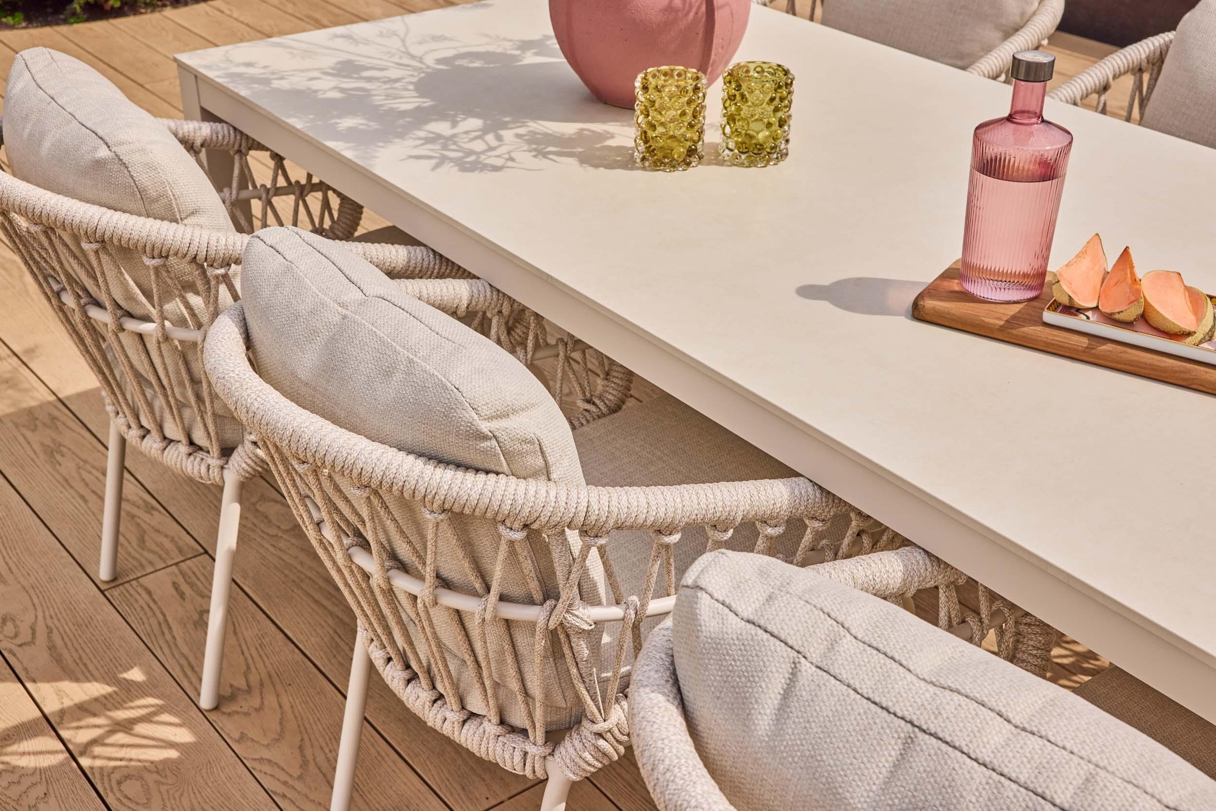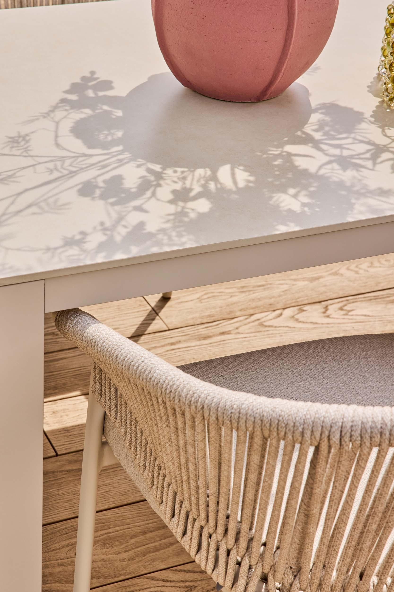 Stoli Tosca prinašajo eleganten kontrast sodobni liniji mize. Zaobljene oblike, prefinjeno rope pletenje in aluminijasto ogrodje s prašnim premazom ustvarjajo harmonično celoto.