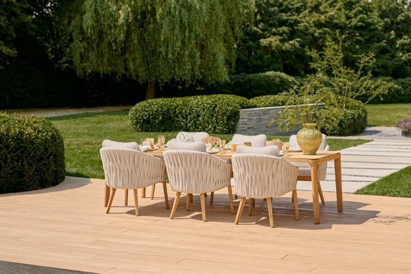 Kombinacija mize Pemba in stolov Senese ustvarja umirjen, naraven ambient, ki se odlično poda tako moderni arhitekturi kot tudi klasičnim vrtovom. Možnost izbire med tikovino in aluminijem omogoča popolno prilagoditev estetiki vašega prostora – od tople naravne elegance do sodobnega, arhitekturno čistega videza.