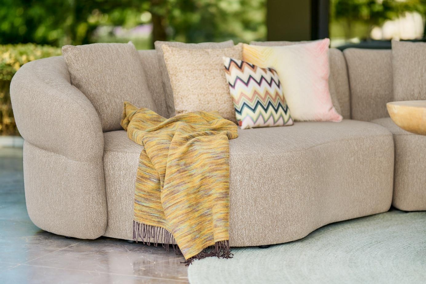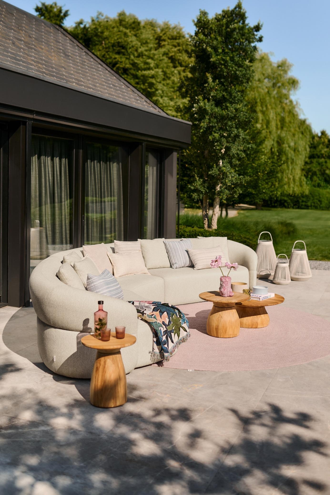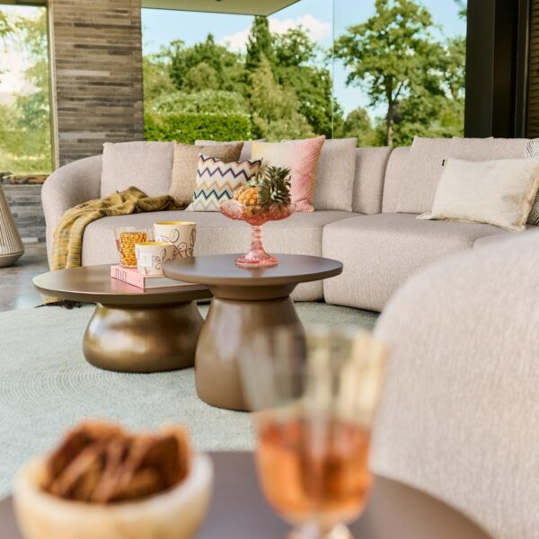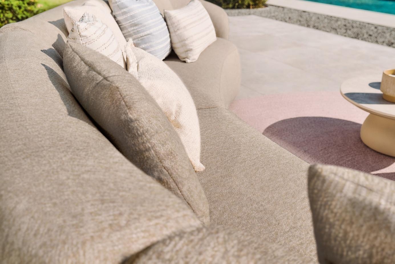 Lounge set Venosa je zasnovan kot modularen set, ki omogoča fleksibilno postavitev – od kompaktnih kotičkov do večjih družabnih kompozicij. Stabilno aluminijasto ogrodje zagotavlja dolgotrajno uporabo, bogato polnjene blazine iz premium bouclé tkanine Sunproof® pa nudijo vrhunsko udobje in odpornost na vremenske vplive, UV-žarke, vlago in plesni.