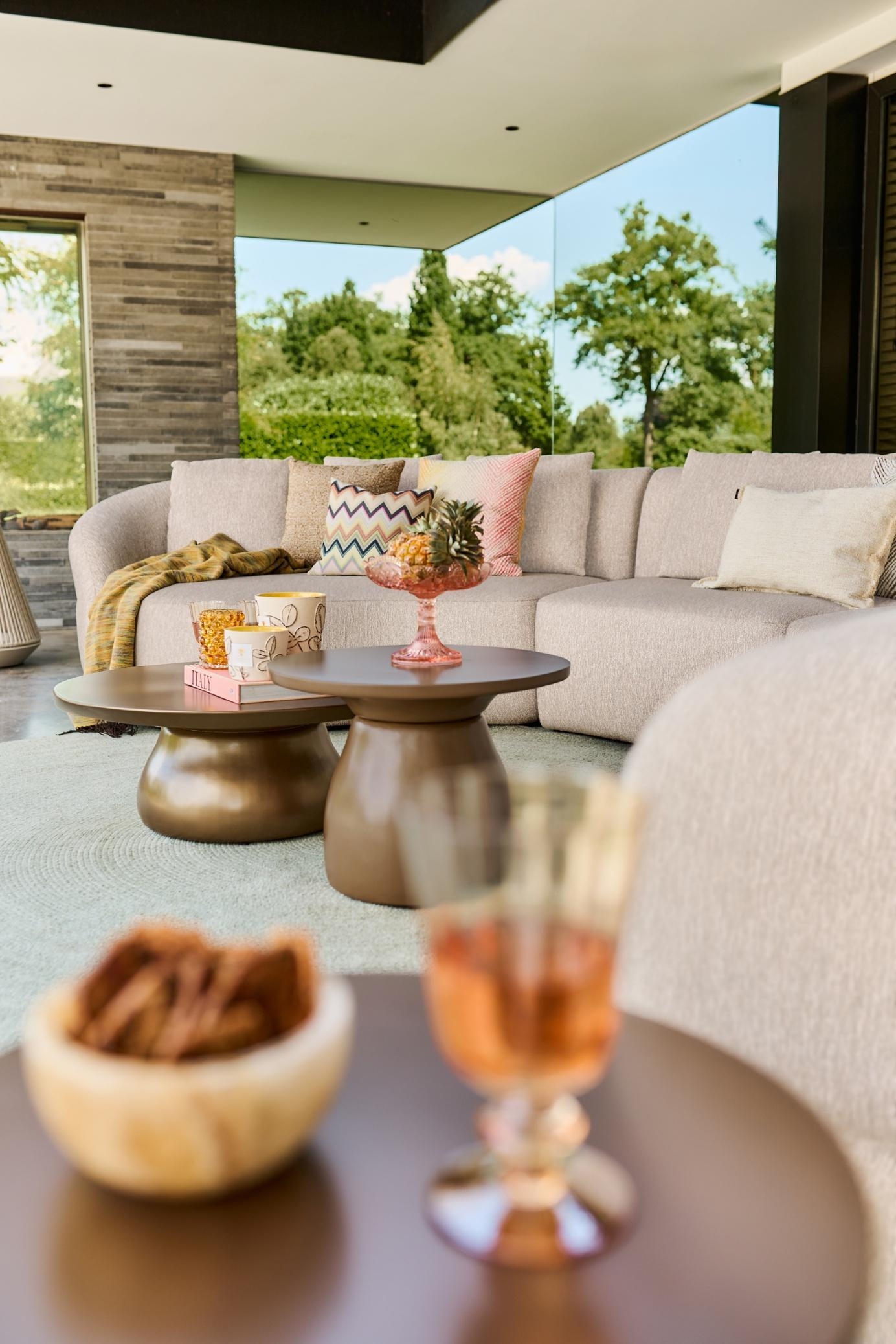 Zaobljene linije in minimalistična oblika ustvarjajo harmoničen in prestižen videz, ki vabi k sproščenemu lounge druženju ali poležavanju. Modularna zasnova omogoča, da posamezne elemente sestavite po meri – trosed, fotelje, kotne elemente ali kombinacijo z dnevno posteljo – in ustvarite popoln lounge kotiček za vaš prostor.