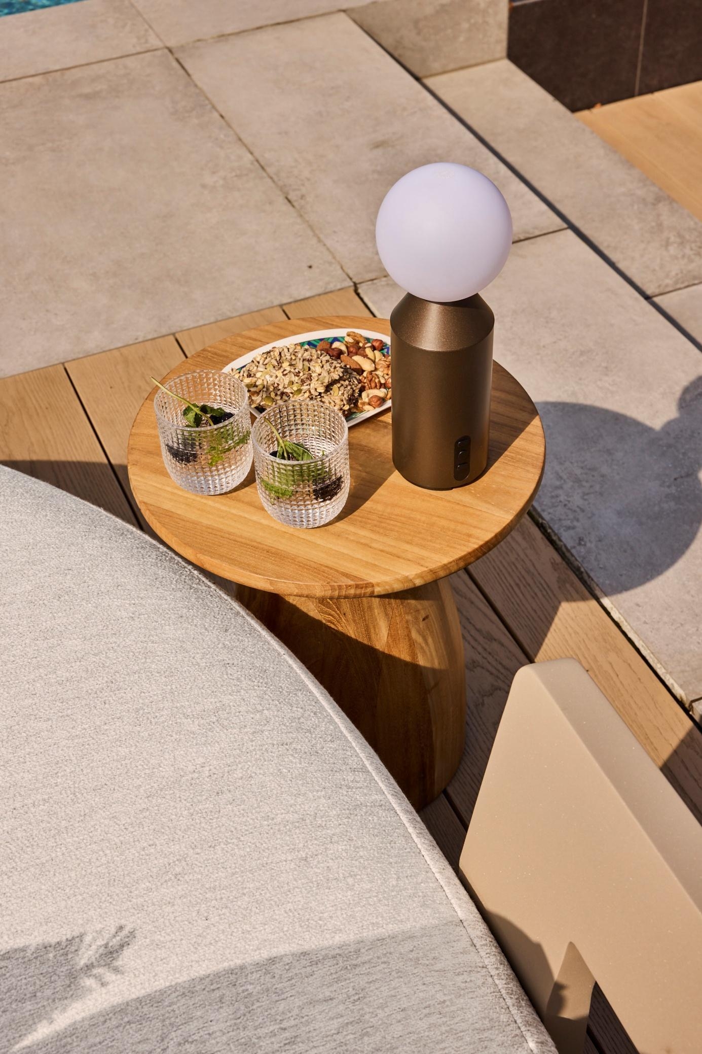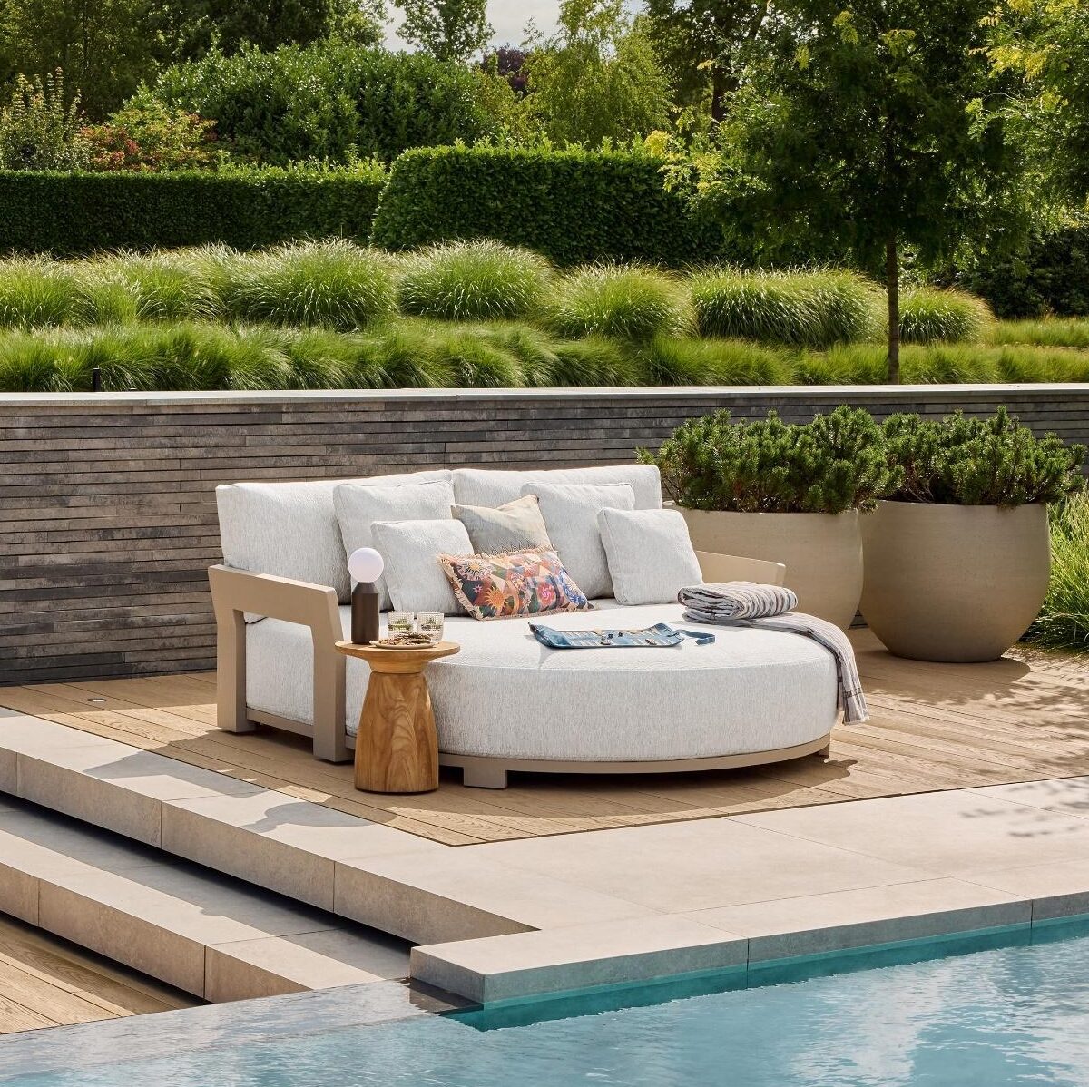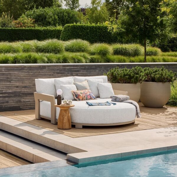 Dnevna postelja Vento v aluminijasti izvedbi Champagne predstavlja vrhunsko interpretacijo sodobnega zunanjega luksuza. Njena prepoznavna okrogla silhueta, prefinjena barvna kombinacija in razkošne bouclé blazine ustvarjajo eleganten prostor za sprostitev, ki na terasi ali ob bazenu pričara občutek ekskluzivnega resort ambienta.